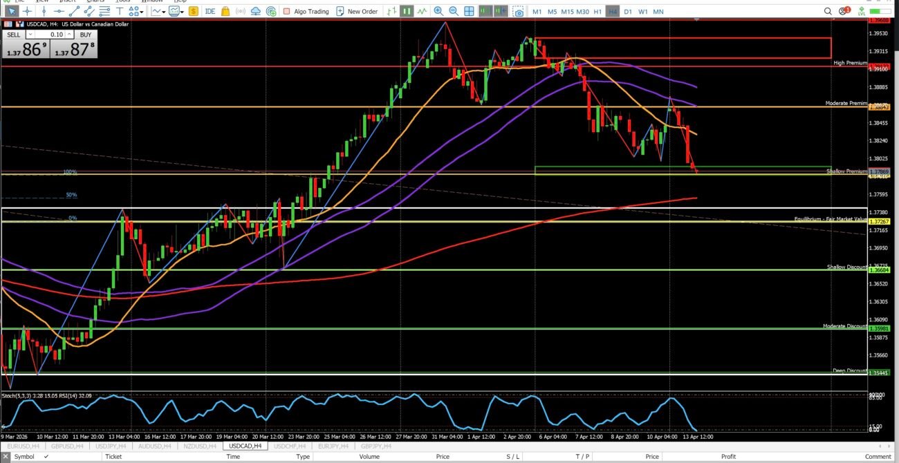 USDCAD remains in a confirmed bearish structure on the 4-hour timeframe. The primary focus remains on continuation sells from premium levels or confirmed breakdowns.